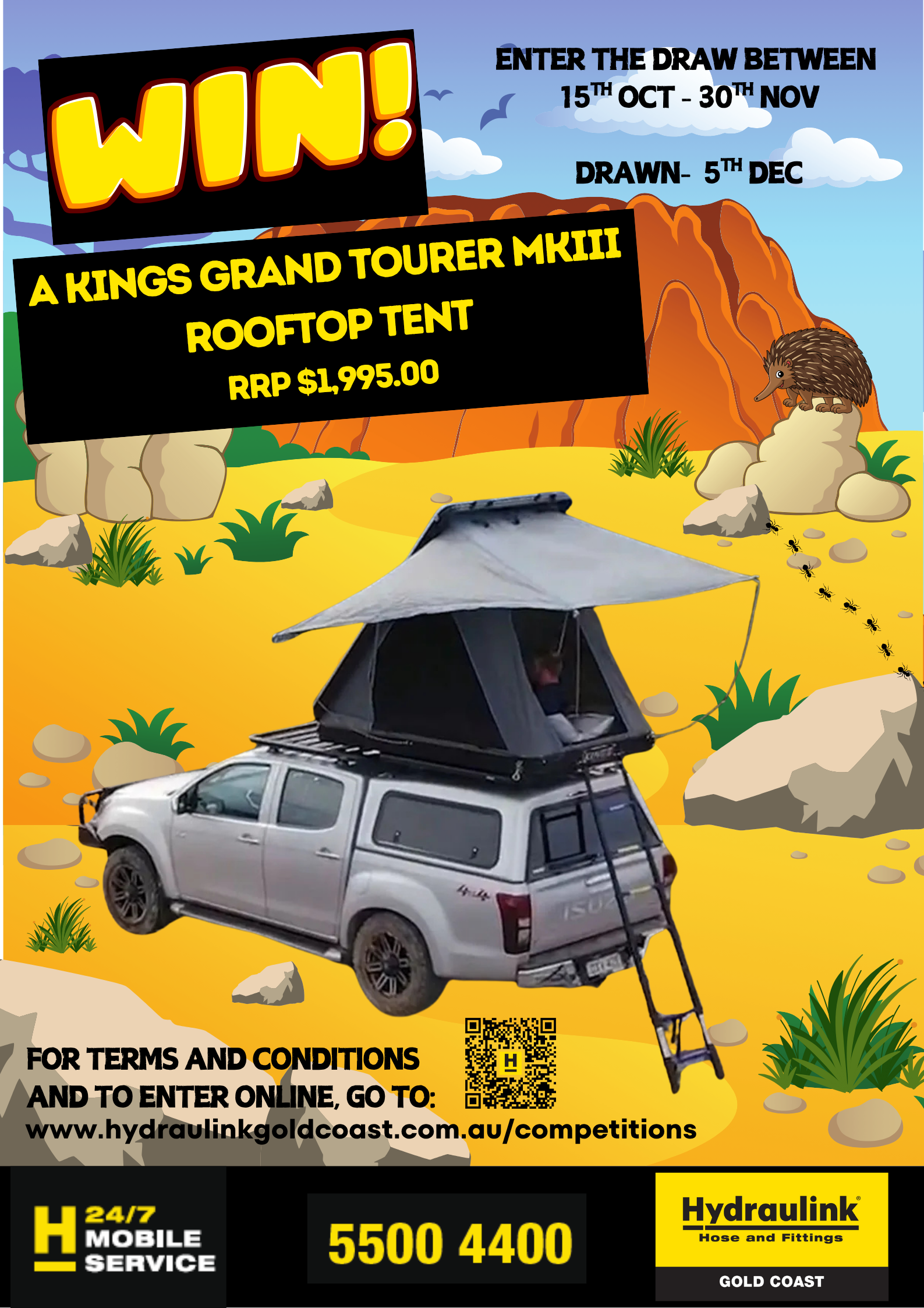 11) The prize includes – 1 x Kings Grand Tourer MKIII Aluminium Rooftop Tent- RRP of $1,995.00. For clarity the vehicle pictured on the promotional material is not included.